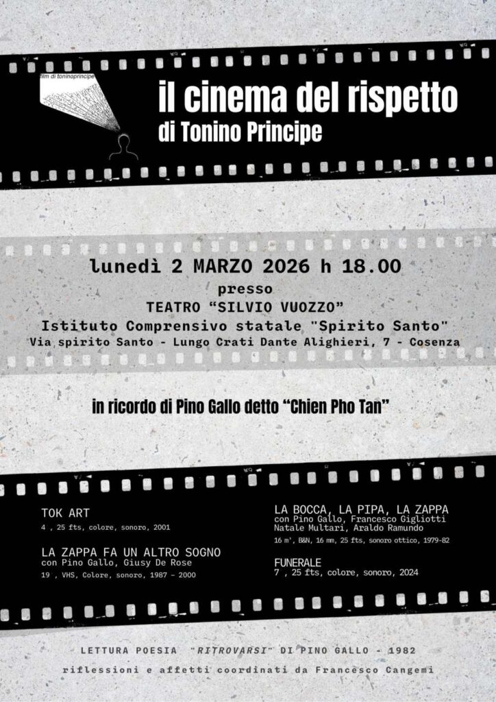 Un tributo alla memoria, all’amicizia e alla cultura cinematografica cittadina. Lunedì 2 marzo 2026, alle ore 18.00, presso il Teatro “Silvio Vuozzo” dell’Istituto Comprensivo statale “Spirito Santo” di Cosenza, si terrà un appuntamento della rassegna “Il cinema del rispetto”, ideato da Tonino Principe come omaggio all’amico Pino Gallo, conosciuto e ricordato in città con il soprannome di “Chien Pho Tan”, a due anni dalla sua scomparsa.