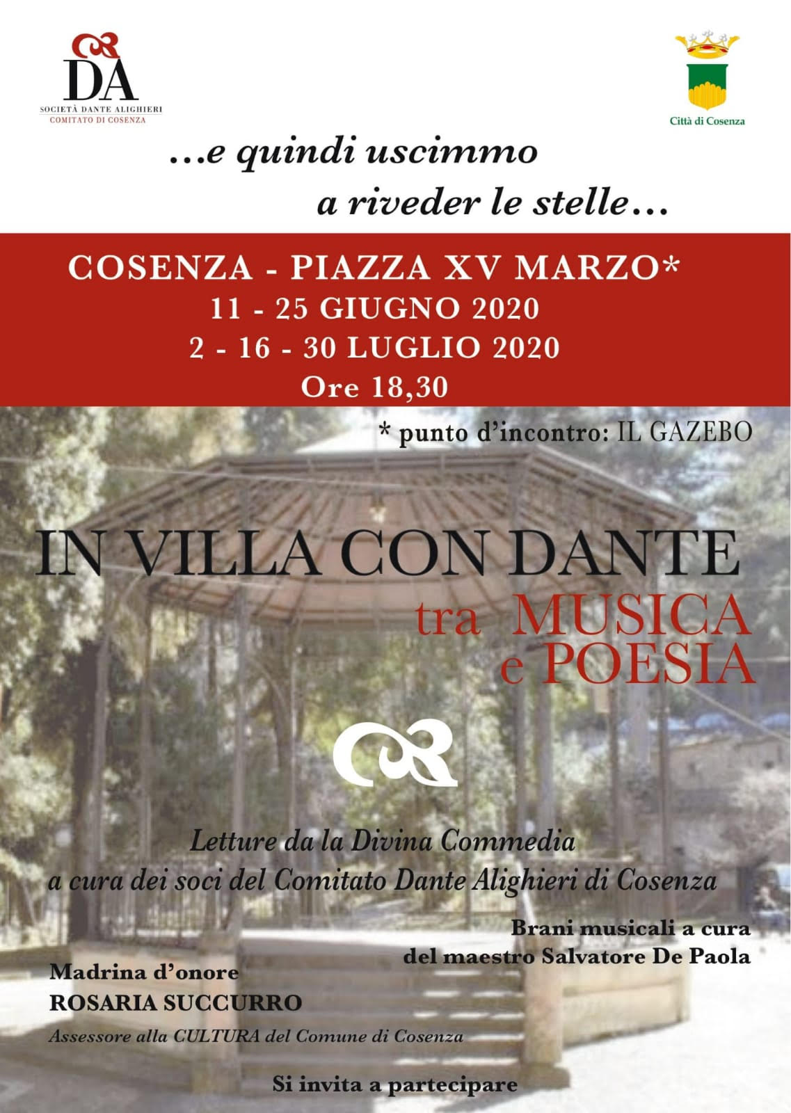 Si tratta di una serie di incontri culturali raggruppati nel titolo “In Villa con Dante tra musica e poesia” per offrire alla città, senza il rischio di assembramenti, cinque incontri, tra giugno e luglio, a cadenza quindicinale, intorno all’antico Gazebo, consistenti in un ciclo di letture tratte da “La Divina Commedia” e affidate agli stessi soci del Comitato di Cosenza della “Dante Alighieri”. I brani musicali saranno a cura del maestro Salvatore De Paola.