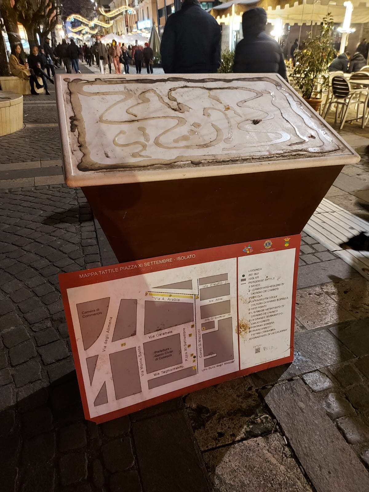 Il Sindaco Franz Caruso, io personalmente e tutta l’Amministrazione comunale – ha aggiunto Covelli – siamo particolarmente grati a coloro che si sono adoperati per recuperare e ripristinare prontamente l’oggetto danneggiato: il geometra Roberto Mirabelli dell’Ufficio tecnico comunale che ieri, pur non essendo in servizio né reperibile, si è prontamente recato sull’isola pedonale a recuperare la mappa del percorso tattile divelta.