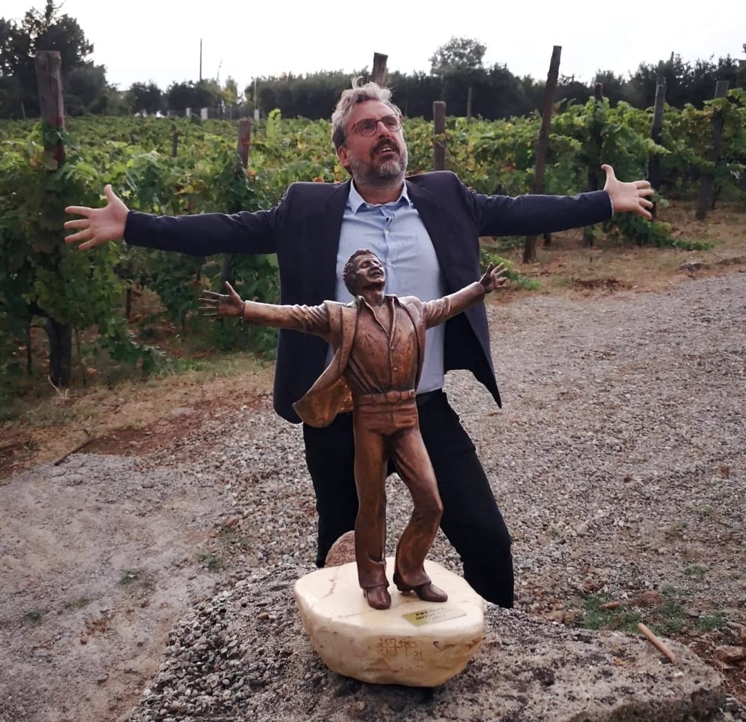 La foto lo ritrae vicino a un busto del grande Domenico Modugno nella stessa espressione di quando intona “Volare” e il titolo è ‘Felice di “andare” (licenza poetica invece di “stare”) lassù. Con ti.’ Dove invece di “con te” c’è “Con ti” in omaggio al conduttore e direttore artistico che l’ha inserito nella lista dei trenta big.
