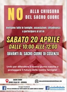 Si svolgerà sabato 20 aprile, dalle ore 10 alle 12, un sit -in pacifico, davanti alla clinica Sacro Cuore di Cosenza, in corso Italia, n. 50