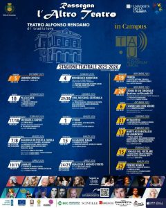“Siamo orgogliosi di presentare un cartellone unico di altissimo livello – spiegano Carmela Caligiuri e Gianluigi Fabiano de L’Altro Teatro – con ben 17 spettacoli. Un progetto nato nel 2013 insieme ad altri due operatori dello spettacolo, Pino Citrigno ed Enzo Noce, che oggi si aggiunge, grazie anche alla volontà di Fabio Vincenzi, di un nuovo tassello con la collaborazione del Teatro Auditorium Unical. Una rassegna che unisce il Comune di Cosenza e l’Università della Calabria. La nuova Stagione vedrà grandi nomi del teatro italiano ed europeo, dal regista uruguaiano Gabriel Calderón a Dimitri Milopulos, da Emma Dante a Veronica Cruciani”.