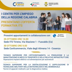 Da quattro anni, il Centro per l’Impiego di Cosenza, di concerto con la Regione Calabria, porta avanti una stabile collaborazione con il sistema degli Istituti tecnici superiori (ITS) della regione che erogano percorsi post-diploma per una formazione tecnica altamente qualificata per entrare subito nel mondo del lavoro. I corsi ITS, infatti, sono realizzati in collaborazione con imprese, università, centri di ricerca ed enti locali per sviluppare nuove competenze in aree tecnologiche considerate strategiche per lo sviluppo economico e per la competitività del territorio.