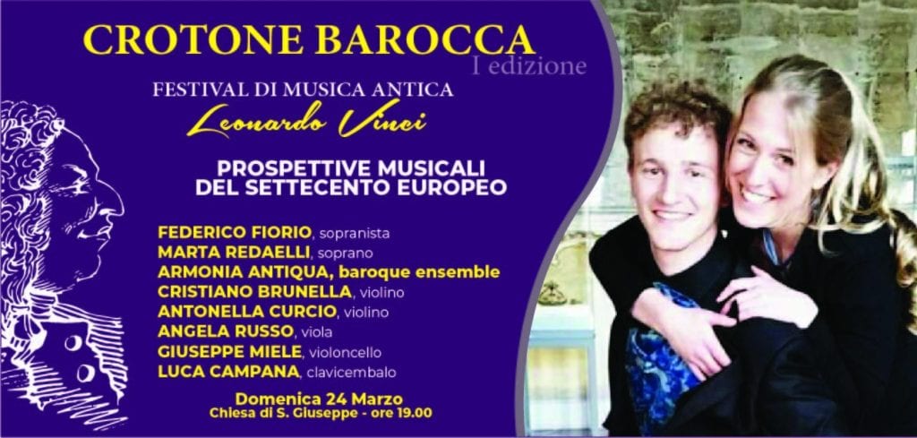 Saranno due grandi voci le protagoniste del penultimo appuntamento del festival di Musica Antica Crotone Barocca: il Sopranista Federico Fiorio e il Soprano Marta Redaelli, si esibiranno insieme all’ensemble crotonese Armonia Antiqua, domenica 24 marzo alle 19.00 nella chiesa di San Giuseppe con Prospettive musicali del Settecento europeo, concerto che ripercorrerà dodici anni di vita musicale italiana e tedesca, Sacra e Profana. Agli estremi gli italiani Antonio Vivaldi (1678) e Leonardo Vinci (1690) che apriranno e chiuderanno il programma, con al centro una delle due composizioni giovanili di Handel, Florindo, che con l’altra opera giovanile, Dafne, era concepita come un’opera unitaria. A chiudere il concerto la Sinfonia Alessandro nell’Indie e il duetto Tu vuoi ch’io viva o cara, dall’opera Artaserse, dramma per musica in tre atti di Leonardo Vinci su libretto di Pietro Metastasio. Melodie d’incantevole bellezza quelle dell’Artaserse, uno dei pochissimi titoli di opera seria a guadagnarsi una diffusione vasta e durevole nel primo Settecento, contribuendo in modo decisivo alla fama del suo autore.