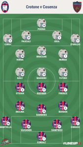 COSENZA (4-3-3): 33 Perina; 2 Corsi, 5 Idda, 29 Pascali, 11 D’Orazio; 7 Mungo, 21 Bruccini, 30 Verna; 32 Baez, 19 Maniero, 25 Tutino. All. Braglia