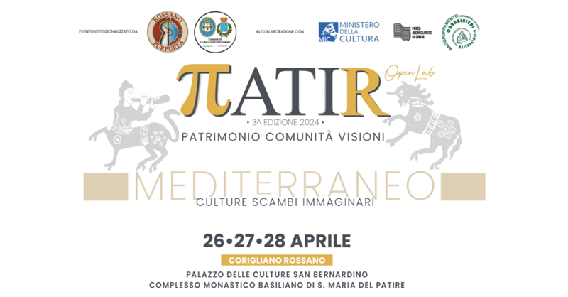 Dal 26 al 28 aprile a Corigliano-Rossano si terrà 3ª EDIZIONE di “ΠATIR”, l’azione culturale progettata e iniziata dal 2022 dall’Associazione Rossano Purpurea e dallo scorso anno istituzionalizzata dalla Città in quanto riconosciuto come alto momento di cultura e progettualità per la nostra Comunità, in cui, come dice il sottotitolo che accompagna l’evento, il Patrimonio, le Visioni e la Comunità sono i tre focus intorno a cui si sono chiamate a confronto numerose e qualificatissime professionalità per animare un’officina di idee vivace e costruttiva.