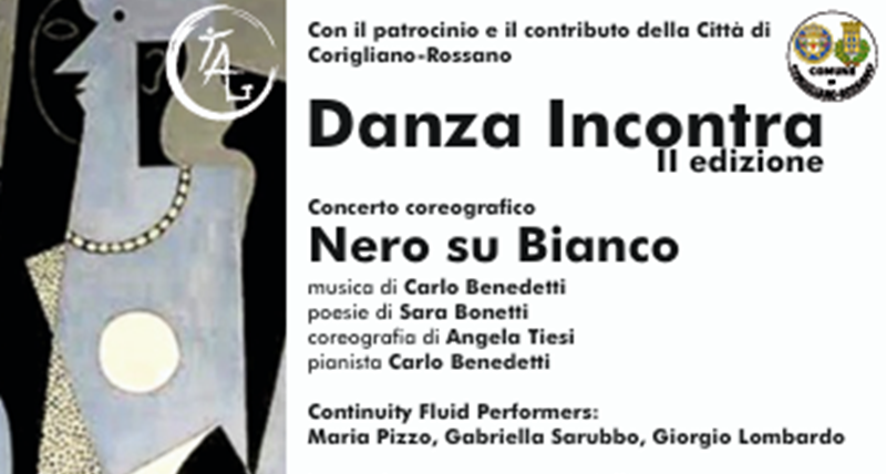 Danza Incontra continua, quindi, la sua azione di diffusione della danza colta in unione con la musica, promuovendo risorse artistiche e professionali. Nero su Bianco si realizza con la partecipazione della compagnia calabrese Continuity Fluid Performers (Giorgio Lombardo, Maria Pizzo, Gabriella Sarubbo) diretta dalla coreografa Angela Tiesi; al pianoforte, l’autore delle musiche, Carlo Benedetti concertista nell’ex Unione Sovietica, in Europa, America Latina, Australia, Medio Oriente; alla voce di Rossana Micciulli, i testi di Sara Bonetti, collaboratrice in trasmissioni televisive della RAI.