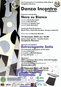 Il nuovo appuntamento per la seconda edizione avrà luogo il 19 gennaio alle 18,00 nel Salone degli Specchi del Castello Ducale di Corigliano Rossano, con Nero su Bianco: un concerto coreografico nel quale la musica pianistica di Carlo Benedetti, i testi poetici di Sara Bonetti e la coreografia di Angela Tiesi si incontrano fondendosi in una serie di istantanee, momenti di vita di una donna in dialogo con se stessa, tentativi di fissarne il sentimento in un tempo altro.