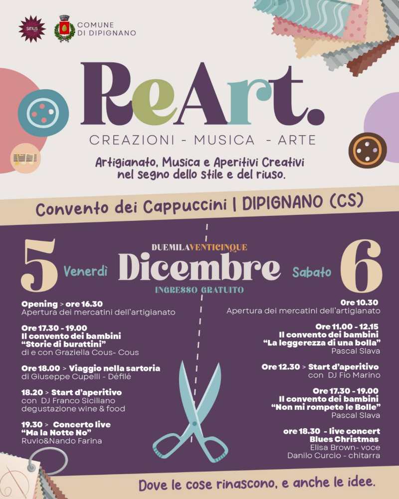 Per il sindaco Gaetano Sorcale «la riapertura dell’ex Convento dei Cappuccini, proprio nei giorni di San Nicola, è un momento speciale per Dipignano. È una perla di architettura religiosa che dalla prima metà del Cinquecento fa parte del nostro paesaggio e che oggi rinasce come spazio di comunità. I nostri artigiani conservano tradizioni che hanno secoli di storia, dal rame lavorato dai “quadarari” alla cultura del pane di antica tradizione artigianale e della cucina che appartiene a questo territorio. ReArt nasce per dare voce a questa ricchezza e mostrare ciò che identifica Dipignano nella sua semplicità, ma anche per dare spazio alla creatività, al riuso dei materiali, alle iniziative per tutte le età. Saranno due giorni di festa per celebrare il nostro Patrono, e per accogliere tutti coloro che vorranno conoscere la vita del nostro laborioso borgo, dove le cose rinascono, e anche le idee».