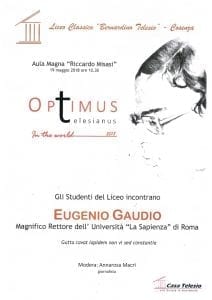Domani il Liceo Classico ‘B. Telesio’ di Cosenza ospiterà il magnifico rettore dell’Università La Sapienza di Roma, prof. Eugenio Gaudio, al quale verrà conferito il riconoscimento Optimus Telesianus in the world.