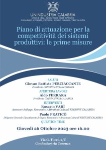 Domani 26 ottobre 2023 alle ore 16, presso la sede di Confindustria Cosenza, si terrà seminario “Piano di attuazione per la competitività dei sistemi produttivi: le prime misure”