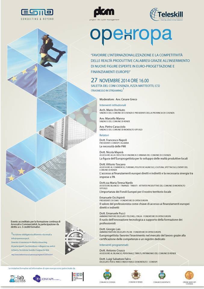 L’Europa che manca in Calabria e di cui c’è estrema necessità, figure professionali che sappiano redigere progetti attinenti anche ai fondi europei Si terrà domani, 27 novembre, alle ore 16.00, presso la Saletta del CONI di Cosenza, sita in Piazza Matteotti l’importante convegno dal titolo “Favorire l’internazionalizzazione e la competitività delle realtà produttive calabresi grazie […]