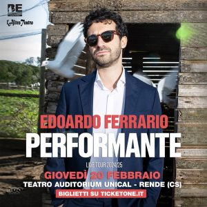 Edoardo Ferrario, tra i comici più apprezzati della scena italiana, torna nei teatri con il suo nuovo spettacolo di stand-up comedy, “PERFORMANTE”. La tournée farà tappa giovedì 20 febbraio al Teatro Auditorium Unical di Rende (CS), per una serata di comicità intelligente e dissacrante. L’evento è organizzato da Be Alternative Festival e L’Altro Teatro.