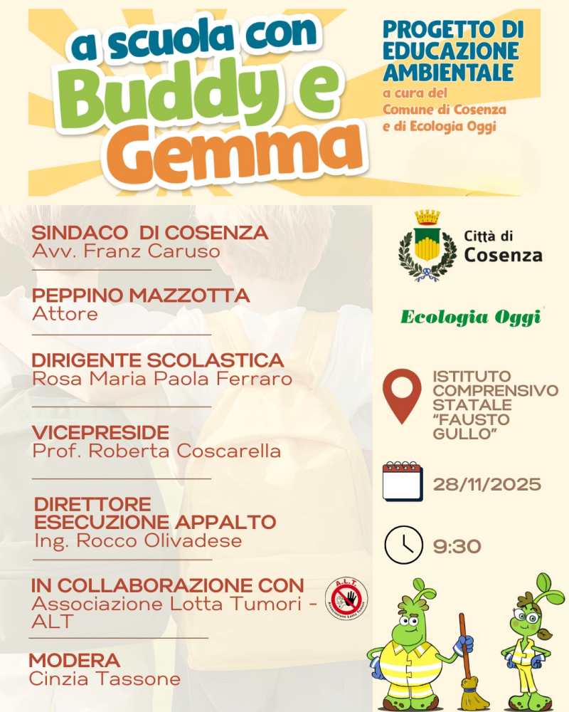 La giornata di domani, dal titolo “A scuola con Buddy e Gemma”, dal nome delle due mascotte scelte per il progetto di educazione ambientale destinato alle scuole e che saranno protagoniste di un cartone animato che sarà proiettato sempre durante l’incontro all’Istituto “Fausto Gullo”, vedrà anche la partecipazione della Dirigente scolastica, Rosa Maria Paola Ferraro, della Vice Preside Roberta Coscarella e dell’Ing.Rocco Olivadese, direttore dell’esecuzione dell’appalto per Ecologia Oggi. A presentare l’incontro, organizzato in collaborazione con ALT (Associazione Lotta Tumori), sarà Cinzia Tassone.