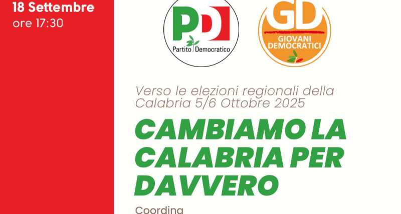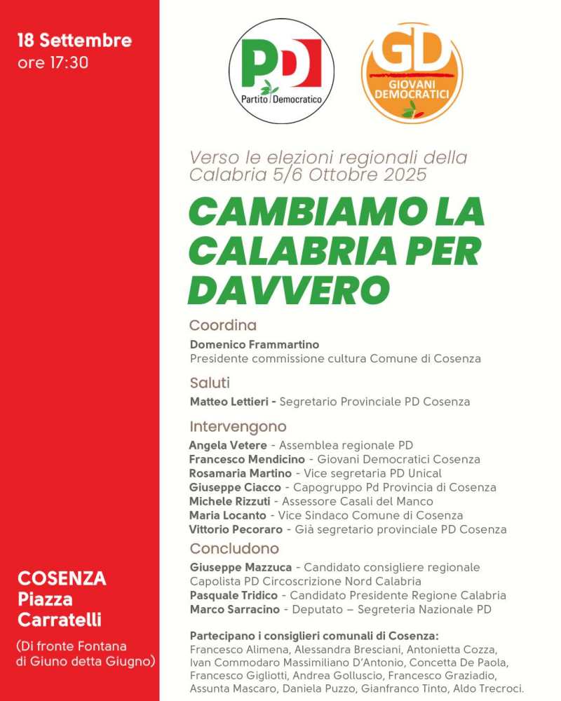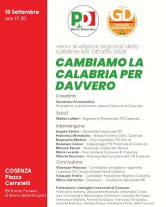 Giovedì 18 settembre alle ore 17:30 in Piazza Carratelli a Cosenza si terrà un’importante iniziativa pubblica dal titolo “Cambiamo la Calabria per davvero”, in vista delle elezioni regionali del 5 e 6 ottobre.