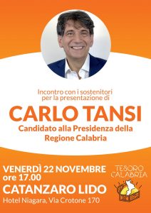 Domani venerdì 22 novembre alle ore 17 a Catanzaro Lido presso l’Hotel Niagara Carlo Tansi, candidato governatore della Regione Calabria, incontrerà i cittadini e i sostenitori ai quali presenterà il suo programma.
