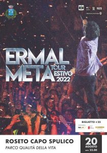 Il Tour Estivo 2022 di Ermal Meta ha toccato alcune tra le più importanti realtà italiane e i più grandi palcoscenici nazionali, dalla affascinante Villa Grimaldi a Genova, per poi attraversare l’Italia passando per Brescia, Novara, Asti, Ferrrara, Porto Recanati, Forte dei Marmi, Zafferana Etnea -solo per citarne alcune – e si concluderà, appunto, a Roseto Capo Spulico il 20 agosto, nel Parco Qualità della Vita, con un concerto indimenticabile.