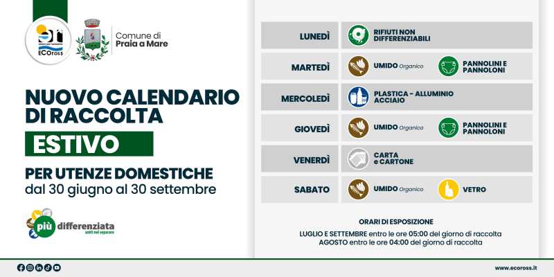 Garantire il benessere dei cittadini e accogliere al meglio chi sceglie Praia a Mare per le vacanze estive, assicurando il massimo impegno per una città pulita, ordinata e decorosa. Sono questi gli obiettivi principali che hanno guidato l’azienda Ecoross – gestore del Servizio di Igiene Urbana messo a punto dall’Amministrazione Comunale – nel predisporre un piano potenziato di raccolta dei rifiuti per le utenze domestiche nel periodo compreso tra il 30 giugno e il 30 settembre.