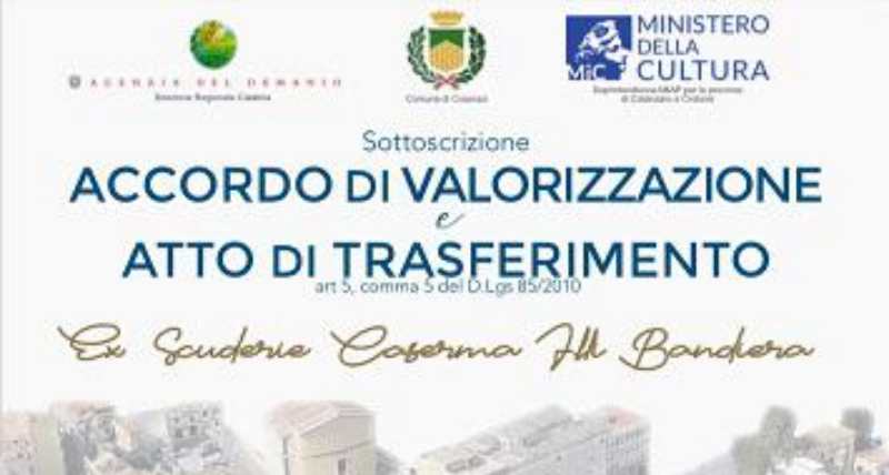 Sarà sottoscritto domani, mercoledì 19 novembre, a Palazzo dei Bruzi, alle ore 12,00, nel salone di rappresentanza, l’accordo di valorizzazione e l’atto di trasferimento dal Demanio regionale al Comune di Cosenza, delle ex scuderie della Caserma “Fratelli Bandiera”.