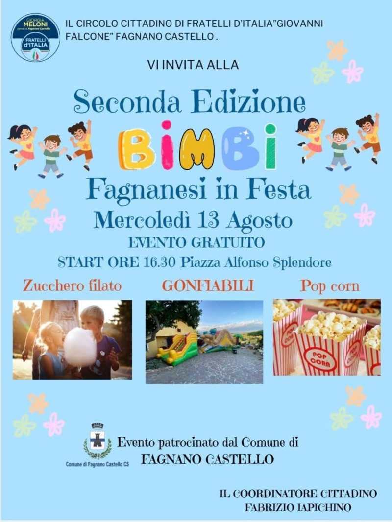 Grande partecipazione per la seconda edizione di “Bimbi fagnanesi in festa” a Fagnano Castello, organizzata dal circolo locale di Fratelli d’Italia. All’iniziativa che ha avuto luogo mercoledì 13 agosto alle ore 16:30, hanno partecipato più di 150 bambini, sono stati messi a disposizione gonfiabili, zucchero filato e pop corn.