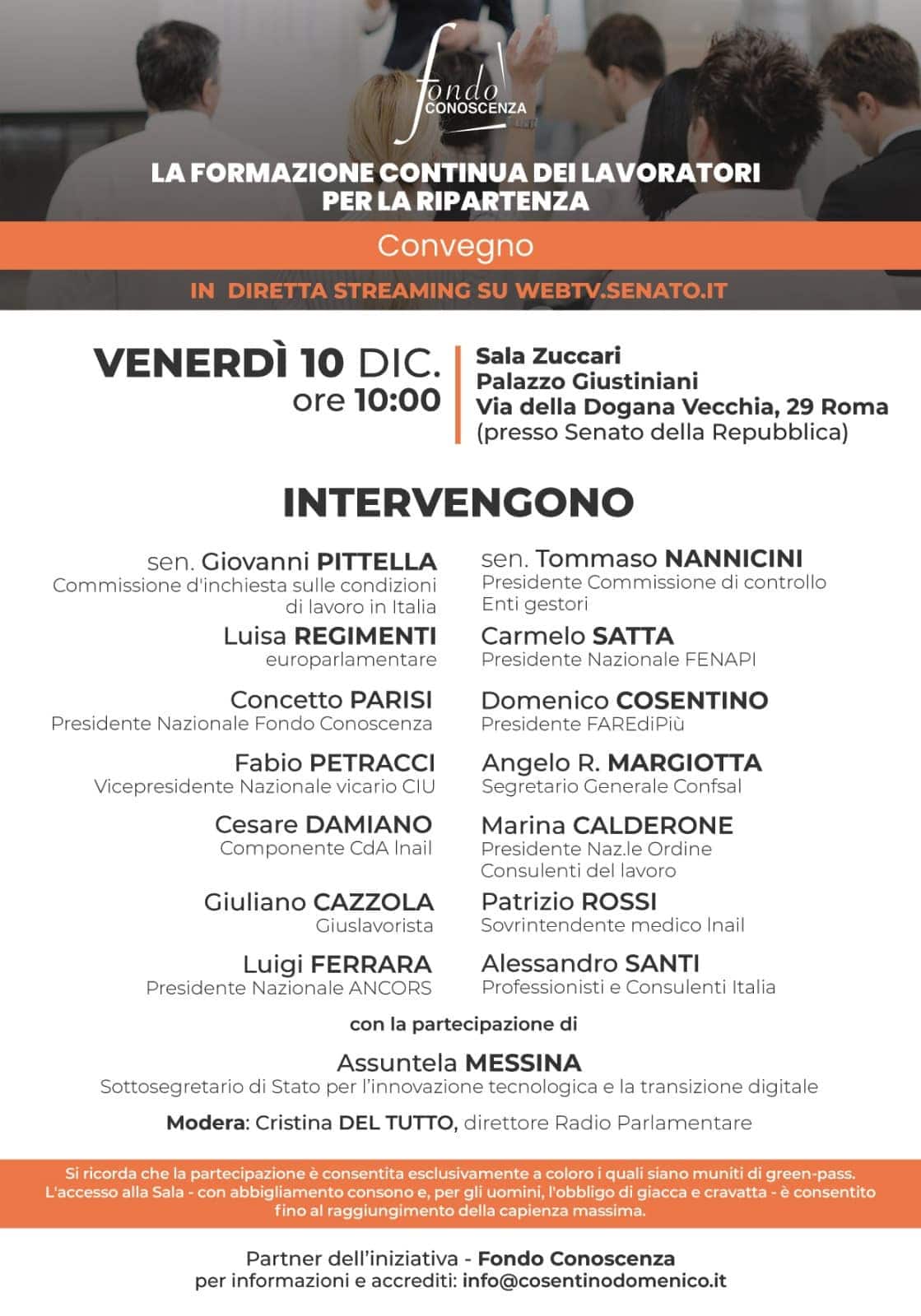 Promosso dall’associazione FAREdiPiù, dal Fondo Conoscenza oltre che da FENAPI e Ancors, sono iscritti a parlare diversi relatori quali: il sen. Giovanni Pittella (Commissione d’inchiesta sulle condizioni di lavoro in Italia); il sen. Tommaso Nannicini (Presidente Commissione di controllo Enti gestori); l’europarlamentare Luisa Regimenti; il Presidente Nazionale FENAPI, Carmelo Satta; Presidente Nazionale Fondo Conoscenza, Concetto Parisi; il Presidente di FAREdiPiù, Domenico Cosentino; Cesare Damiano (Componente CdA Inail); il Presidente Nazionale Ordine Consulenti del lavoro, Marina Calderone; Giuliano Cazzola, giuslavorista; Patrizio Rossi, sovrintendente medico Inail; Luigi Ferrara, Presidente Nazionale ANCORS; Alessandro Santi (Professionisti e Consulenti Italia). Parteciperà inoltre Assuntela Messina, Sottosegretario di Stato per l’innovazione tecnologica e la transizione digitale.