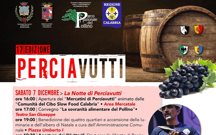 Nel ricco programma che vedrà in concerto Ciccio Nucera con la sua band e Tony Esposito nella serata del 7 dicembre in Piazza Umberto I, grande spazio ai prodotti della rete territoriale calabrese con la chiocciola attraverso il Mercato delle Comunità del Cibo presso l’area mercatale, che radunerà a Mormanno le esperienze più significative ed i produttori impegnati in Calabria nella produzione del cibo buono, pulito e giusto. Sabato la grande festa prenderà il via con la benedizione dei quartieri e l’accensione delle luminarie e dell’albero di Natale alle ore 19.00 da Piazza Umberto I e la conseguente apertura dei Vuttari nei quartieri Capo Lo Serro, Casalicchio, Costa e Torretta che in questi giorni sono al lavoro per arrivare preparati all’appuntamento, grazie al coinvolgimento di oltre 200 volontari che sono l’esempio lampante di come “Perciavutti” a Mormanno sia festa di popolo.