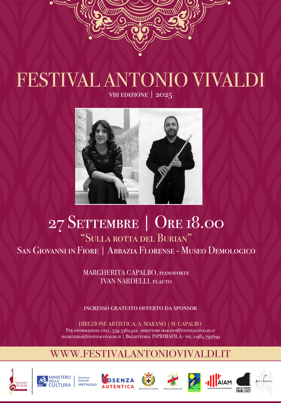 Sempre il 27 settembre, alle ore 18.00, l’Abbazia Florense di San Giovanni in Fiore ospiterà il recital “Sulla rotta del Burian”, che vedrà dialogare il pianoforte di Margherita Capalbo con il flauto di Ivan Nardelli. Una serata ad ingresso gratuito, resa possibile grazie al sostegno degli sponsor, che invita il pubblico a un viaggio sonoro dalle atmosfere visionarie e sospese, in uno degli scenari più emblematici della spiritualità florense.