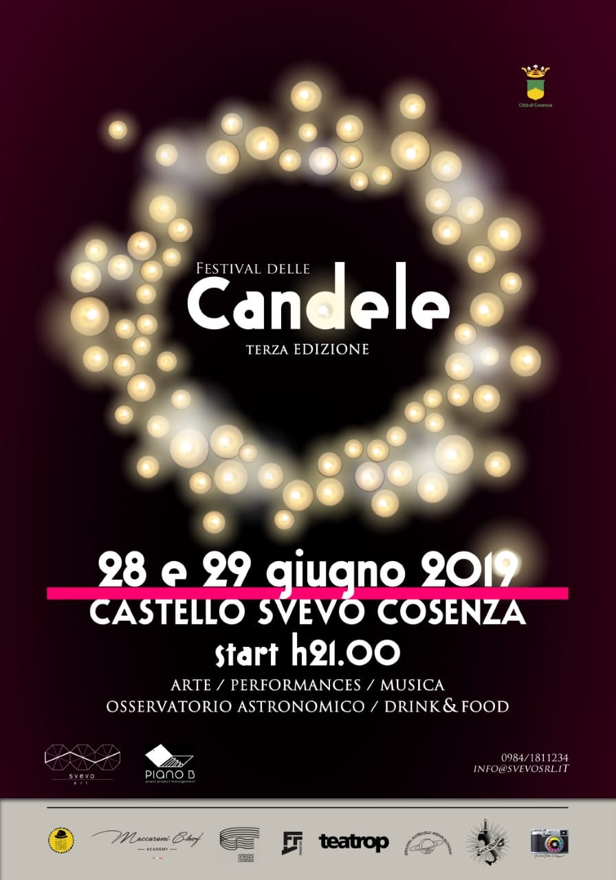 Il“Festival delle Candele” è un evento alla sua terza edizione ideato e organizzato da Svevo srl e Piano B – Event Project Management, con il patrocinio del Comune di Cosenza. Si svolgerà i prossimi 28 e 29 giugno al Castello Svevo di Cosenza, in cui si celebrerà la naturale luce emessa dalle candele. Ogni sorgente artificiale verrà quindi spenta e si utilizzeranno per l’illuminazione oltre 5000 candele, incorniciando le antiche architetture che, per l’occasione, vedranno la presenza di numerose attività artistico-culturali e di intrattenimento.
