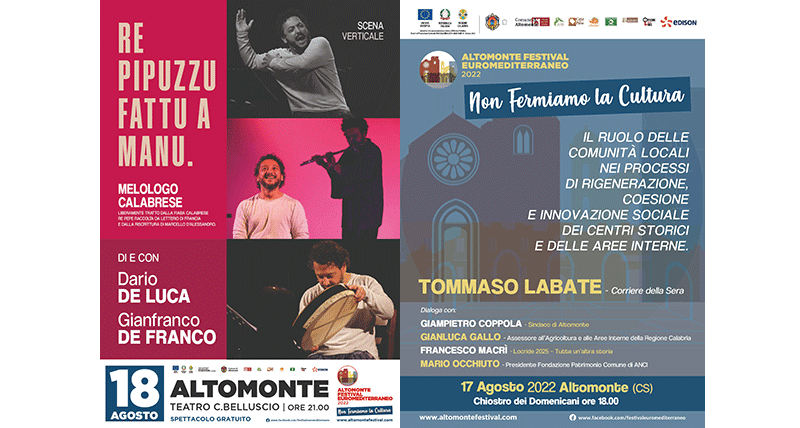 Giovedì 18 sarà la volta di Scena Verticale che arriva al Festival Euromediterraneo di Altomonte con l’attore e regista Dario De Luca in “Re Pipuzzu fattu a manu – Melologo calabrese per tre finali” che vedrà in scena, dalle 21 al Teatro Belluscio con ingresso gratuito, anche il musicista Gianfranco De Franco.