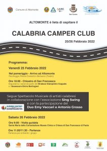 Contestualmente si potrà assistere alla prima giornata della tappa altomontese del Calabria Camper club. La carovana arriverà nel pomeriggio antistante il Teatro Costantino Belluscio e, alle 18 al Chiostro di San Francesco, ci saranno i saluti ai viaggiatori da parte del sindaco Giampietro Coppola e dell’assessore alla cultura Elvira Berlingieri.