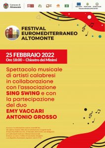 Domenica 27 febbraio, alle 18.30 al Palazzo Municipale, altro appuntamento con gli artisti calabresi e Sing Swing con la partecipazione di Roberto Bozzo e Giovanni Altomare dei Sabatum Quartet. Lunedì 28, stesso orario e stessa location, i Sing Swing incontreranno gli Mbrambatallà.