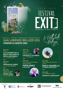 S. Lorenzo Bellizzi, 20 agosto ’24. Trekking nel borgo oppure alla scoperta di grotte preistoriche, laboratori di danza tradizionale, teatro per famiglie e per quelli un po’ cresciuti, la musica di un pianista fuori posto e l’immancabile degustazione gastronomica. Con un programma che sa di avventura, il 23 agosto prossimo torna ‘Notti belle a Bellizzi’, il consueto appuntamento estivo del festival EXIT: Deviazioni in arte e musica a San Lorenzo Bellizzi (CS), voluto dall’Amministrazione comunale guidata dal sindaco Antonio Cersosimo, e inserito nel progetto più ampio di ‘San Lorenzo Bellizzi borgo ospitale’, da quando è entrato a far parte rete delle Comunità Ospitali di Calabria.