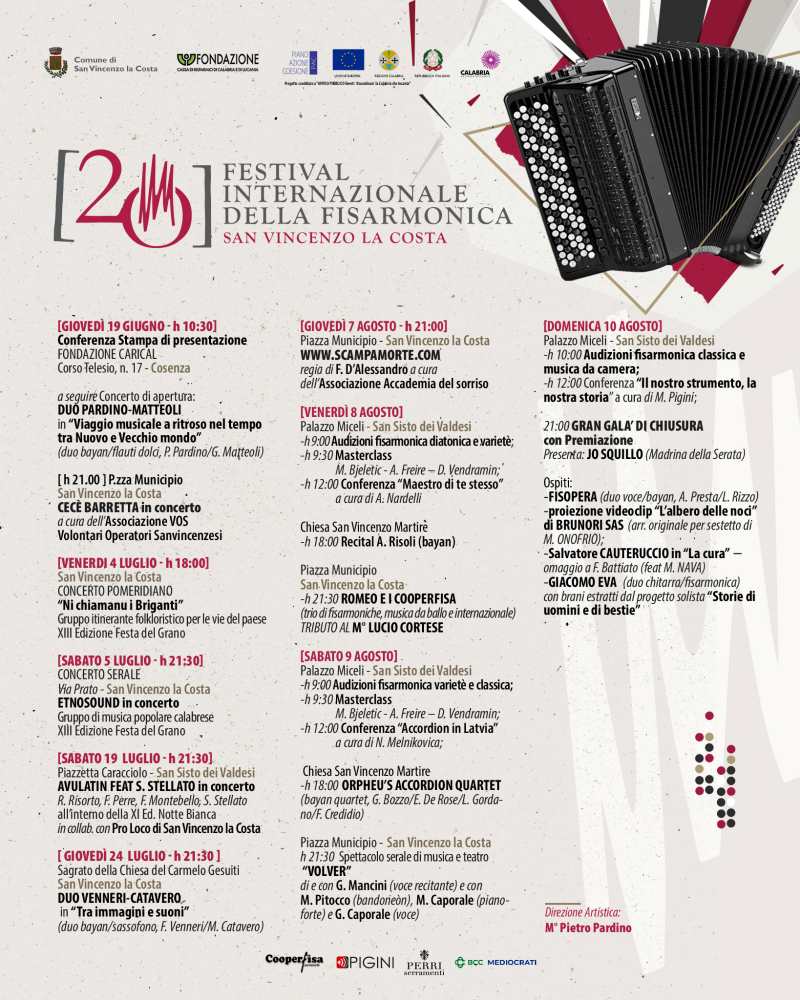 «San Vincenzo La Costa – ha dichiarato il sindaco Gregorio Iannotta – investe da vent’anni nella cultura e nella formazione musicale. La fisarmonica, con le sue più svariate sonorità e le forme specifiche che derivano dalle aree geografiche di appartenenza, rappresenta il colore, il riferimento sonoro che spiega la cultura dei luoghi. Qui ne accogliamo tantissime, perché insieme rappresentano una straordinaria ricchezza. Il Festival è un’occasione per ascoltarle dal vivo, per comprenderne e riconoscerne il valore attraverso esperienze artistiche diverse, in un contesto che rimane autentico, aperto e ospitale».