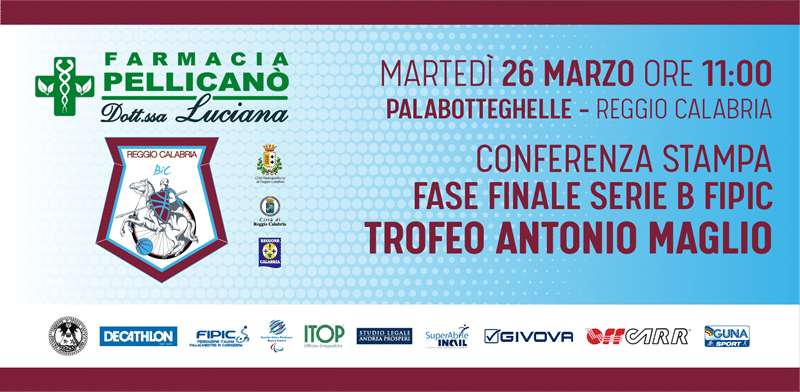 Martedì 26 marzo alle ore 11:00 all’interno del Palabotteghelle di Reggio Calabria si terrà la conferenza stampa di presentazione delle ‘Final Four’ del Campionato Nazionale di Serie B FIPIC ‘Trofeo Antonio Maglio’.Final FourAlle fasi finali, che si terranno al Palabotteghelle sabato 30 e domenica 31 marzo, parteciperanno le squadre di Reggio Calabria (Farmacia dott.ssa Pellicanò Reggio BIC), Parma (Laumas Elettronica Gioco Parma), Padova (Millennium Basket 3A) e Firenze (Volpi Rosse Menarini Firenze) che si contenderanno l’unico posto disponibile per accedere in Serie A.