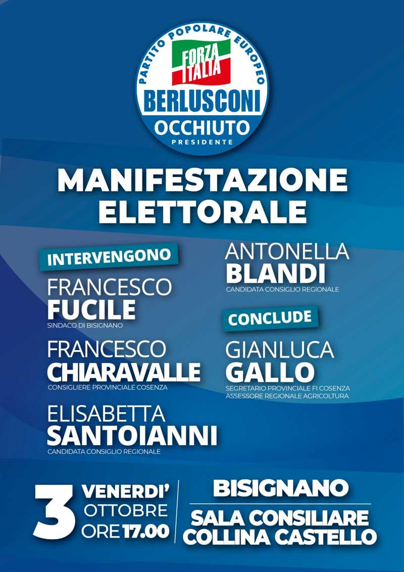 Forza Italia forte del radicamento sul territorio di Bisignano, incontra i cittadini venerdì 3 ottobre 2025 presso la sala consiliare in Collina Castello, in occasione del rinnovo del Consiglio Regionale della Calabria e nella sua fase più calda.