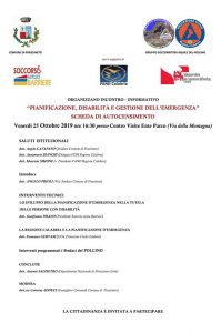 La giornata proseguirà poi alle ore 16:30 presso il Centro Visite dove l’Amministrazione Comunale in collaborazione con Soccorso Senza Barriere, Fand e Fish promuoverà un incontro per presentare alla popolazione la scheda di auto censimento elaborata dalle federazioni Fand e Fish che il comune di Frascineto ha fatto propria per avviare il report sui bisogni della popolazione con disabilità. All’incontro parteciperanno il Sindaco di Frascineto, Angelo Catapano, il vice sindaco, Angelo Prioli, Francesco Gervasi (UOA Protezione Civile Regione Calabria), Gianfranco Pisano (Presidente Soccorso senza Barriere), Anna Maria Bianchi (Delegata FISH Regione Calabria), Maurizio Simone (Presidente FAND Regione Calabria). Concluderà i lavori – coordinati da Caterina Adduci, consigliere comunale di Frascineto, Antonio Salpietro del Dipartimento Nazionale Protezione civile. Sabato 26 ottobre invece si avvierà una mappatura delle vie di fuga con sopralluoghi operativi sul territorio comunale.