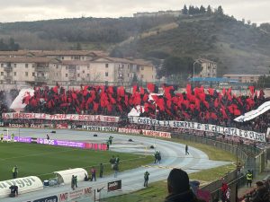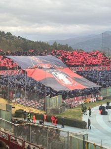 Entrano le squadre e questa volta il volume lo alzano le due curve con coreografie da sballo. Quella della Curva Sud e’ stile anni 80 con bandieroni e quello striscione che recita: “ lo insegna la storia lo dice la fede il Cosenza da sempre e’ di chi lotta e ci crede”.