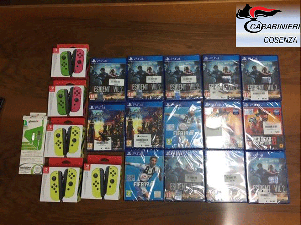 I fermati sono stati accompagnati presso la Caserma dei Carabinieri di Scalea per essere sottoposti ad un controllo più accurato, a seguito di perquisizione personale e veicolare venivano rinvenuti, all’interno della borsa, 15 videogames, 5 joypad ed un cavetto per ricarica cellulare, del valore complessivo di 1.700 euro, mentre all’interno dell’autovettura in uso ai malfattori sono stati ritrovati alcuni strumenti da effrazione.
