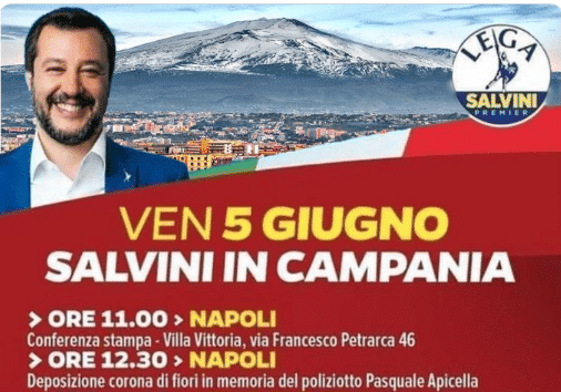 Il leader della Lega ha annunciato sulla sua pagina Facebook l’imminente tour in Campania, che si terrà oggi venerdì 5 giugno e lo vedrà fare tappa a Napoli, Nola e Avellino in ben cinque appuntamenti. Nel manifesto però compare in bella mostra e in tutta la sua magnificenza una foto dell’Etna innevato, scambiato forse dallo staff di Salvini con il Vesuvio.