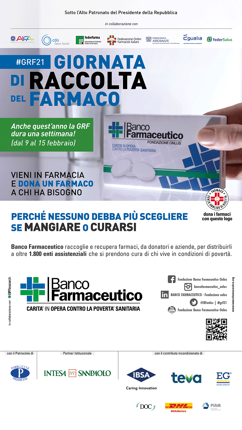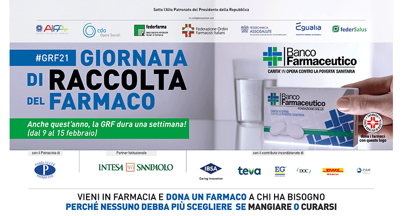 La GRF si volge sotto l’Alto Patronato del Presidente della Repubblica, con il patrocinio di Aifa e in collaborazione con Cdo Opere Sociali, Federfarma, Fofi, Federchimica Assosalute, Egualia – Industrie Farmaci Accessibili,Federsaluse BFResearch. Intesa Sanpaolo è Partner Istituzionale dell’iniziativa. La GRF è realizzata grazie all’importante contributo incondizionato di IBSA, Teva ed EG Stada Group, e al sostegno di DOC Generici, Zentiva, DHL Supply Chain e Piam Farmaceutici. La Giornata è supportata da Responsabilità Sociale Rai, Mediafriends, La7, Sky per il sociale, e Pubblicità Progresso.