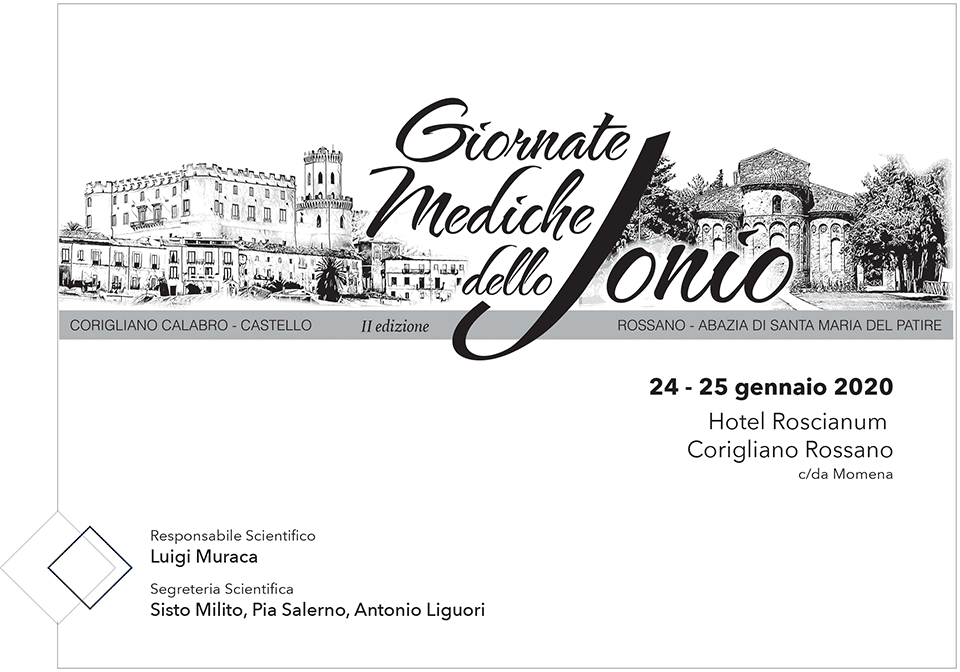 Continuano gli appuntamenti medico-scientifici in Calabria, in particolare venerdì 24 e sabato 24 gennaio a Corigliano – Rossano, con il congresso “Giornate mediche dello Jonio” accreditato ECM per Medici Chirurghi (tutte le specializzazioni), Farmacisti, Infermieri, Tecnici di neurofisiopatologia.