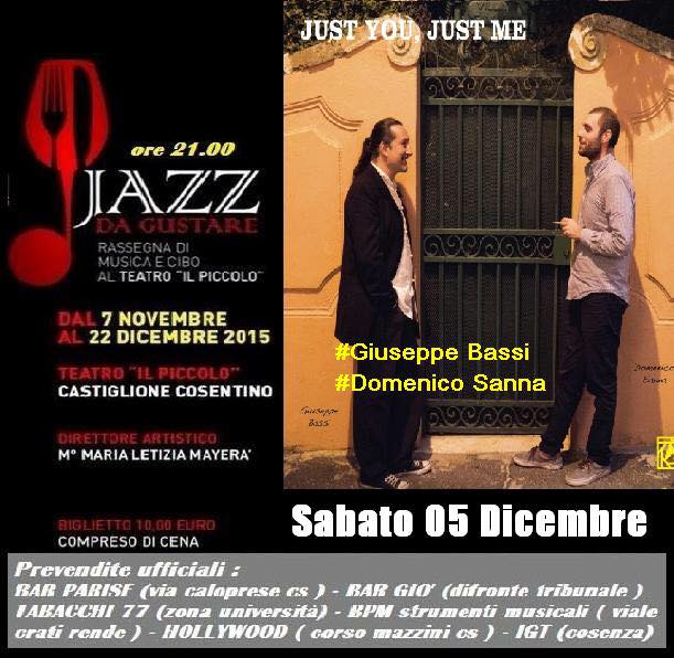 Dopo l’ennesimo grande successo della serata di “Jazz da gustare” dello scorso 28 novembre, che ha visto sul palco del teatro “ll Piccolo” di Castiglione Cosentino, il progetto “Mina in Jazz”, arriva il prossimo sabato 5 novembre, il duo formato da Domenico Sanna e Giuseppe Bassi, con il loro progetto “Just you, just me”.