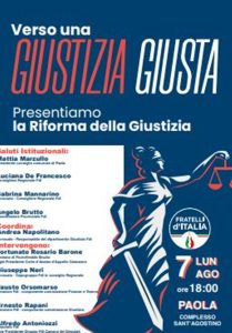 Un convegno sulle prime riforme della giustizia del governo Meloni. “Le riforme liberali per una giustizia più giusta”: l’iniziativa è di Fratelli d’Italia e l’appuntamento si terrà il prossimo 7 agosto 2023 alle ore 18,00 presso il Complesso Sant’Agostino di Paola.