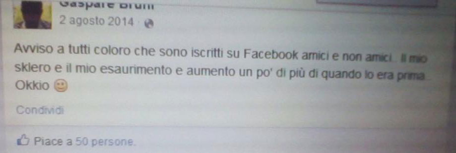 In uno datato agosto 2014, Bruni dice: “Avviso a tutti coloro che sono iscritti su Facebook amici e non amici. il mio sklero e il mio esaurimento e aumento un pò di piu di quando lo era prima. Okkio”.