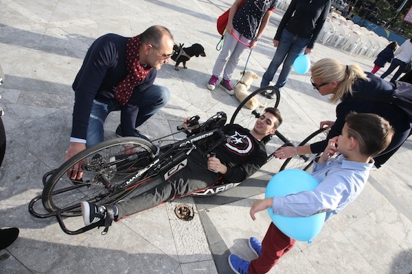 Marco ieri era presente durante la manifestazione e si è divertito a provare l’handbike grazie alla collaborazione del team del “Giro d’Italia in Handbike”, partners dell’iniziativa.