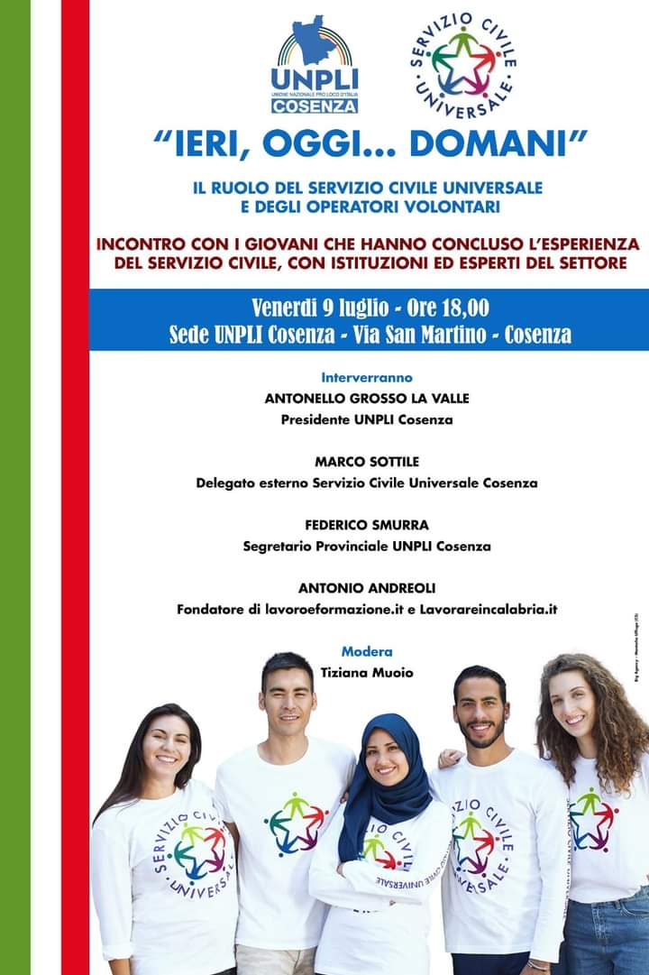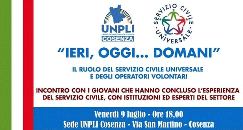 Si terrà domani 9 luglio, alle ore 18, presso la sede provinciale dell’UNPLI di Cosenza, l’incontro dal titolo “Ieri, oggi… Domani”, il ruolo del Servizio Civile Universale e degli operatori volontari”.