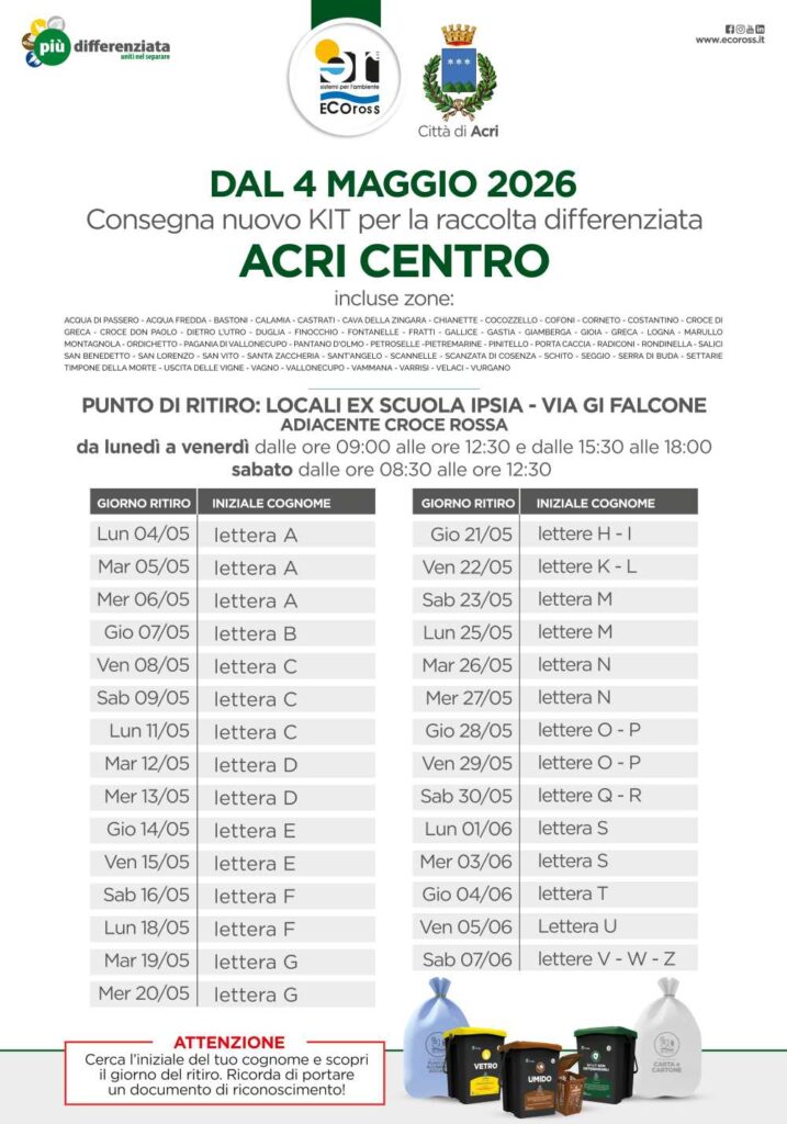 • Acri Centro – punto di ritiro presso ex Scuola Ipsia (via G. Falcone adiacente Croce Rossa) dal lunedì al venerdì dalle ore 09:00 alle ore 12:30, il sabato dalle ore 08:30 alle ore 13:00;
