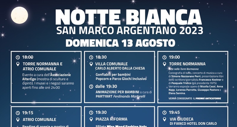 Concerti, arte, moda (Miss Mood), ballo, negozi aperti fino a mezzanotte, e tutti i luoghi di interesse storico verrano resi fruibili al pubblico. L’evento è organizzato dalla società di calcio Audace San Marco e dall’associazione Riforma in Rock, con il patrocinio della Regione Calabria, Comune di San Marco Argentano e Pro Loco. Le associazioni coinvolte saranno AlterEgo, Nicoletti Management, Gold Dance Calabria e Azione Giovanile Sammarchese.