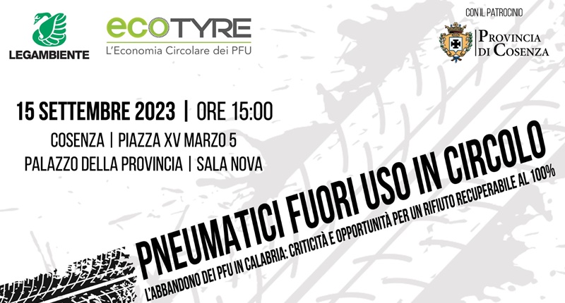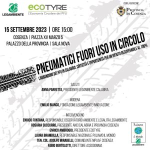Il 15 settembre la Provincia di Cosenza ospita il convegno “Pneumatici fuori uso in circolo. L’abbandono dei PFU in Calabria: criticità e opportunità per un rifiuto recuperabile al 100%”, con i saluti di Anna Parretta, Presidente Legambiente Calabria e la moderazione di Emilio Bianco, Fondazione Legambiente Innovazione.
