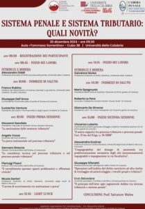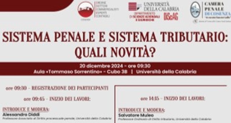 Il 20 dicembre, presso l’Università della Calabria, Aula Tommaso Sorrentino (cubo 3B, piano terra), si terrà un importante convegno-dibattito sul tema “Sistema penale e sistema tributario: quali novità? ”. L’evento inizierà alle ore 9:30 con una sessione al mattino e una al pomeriggio.